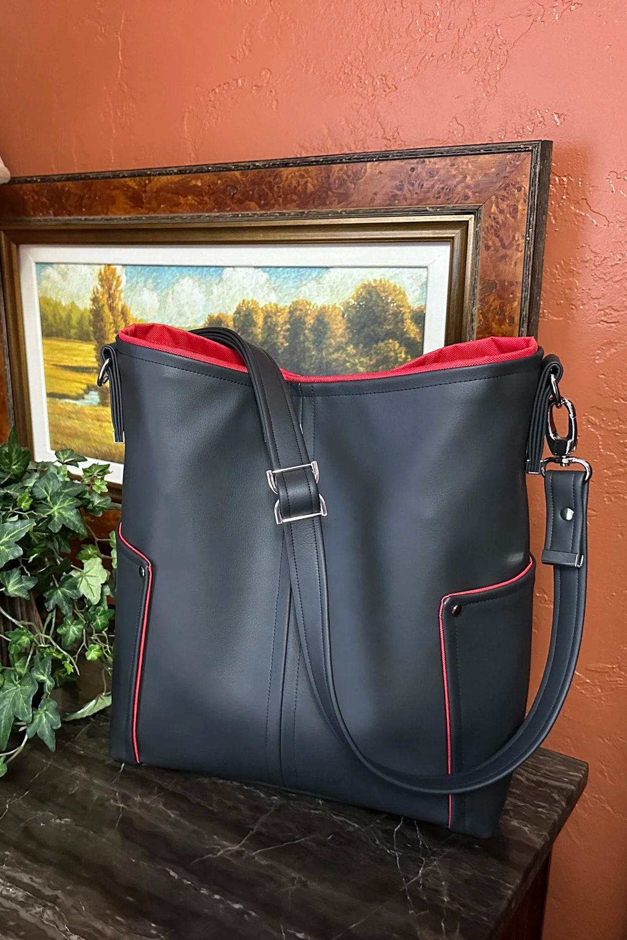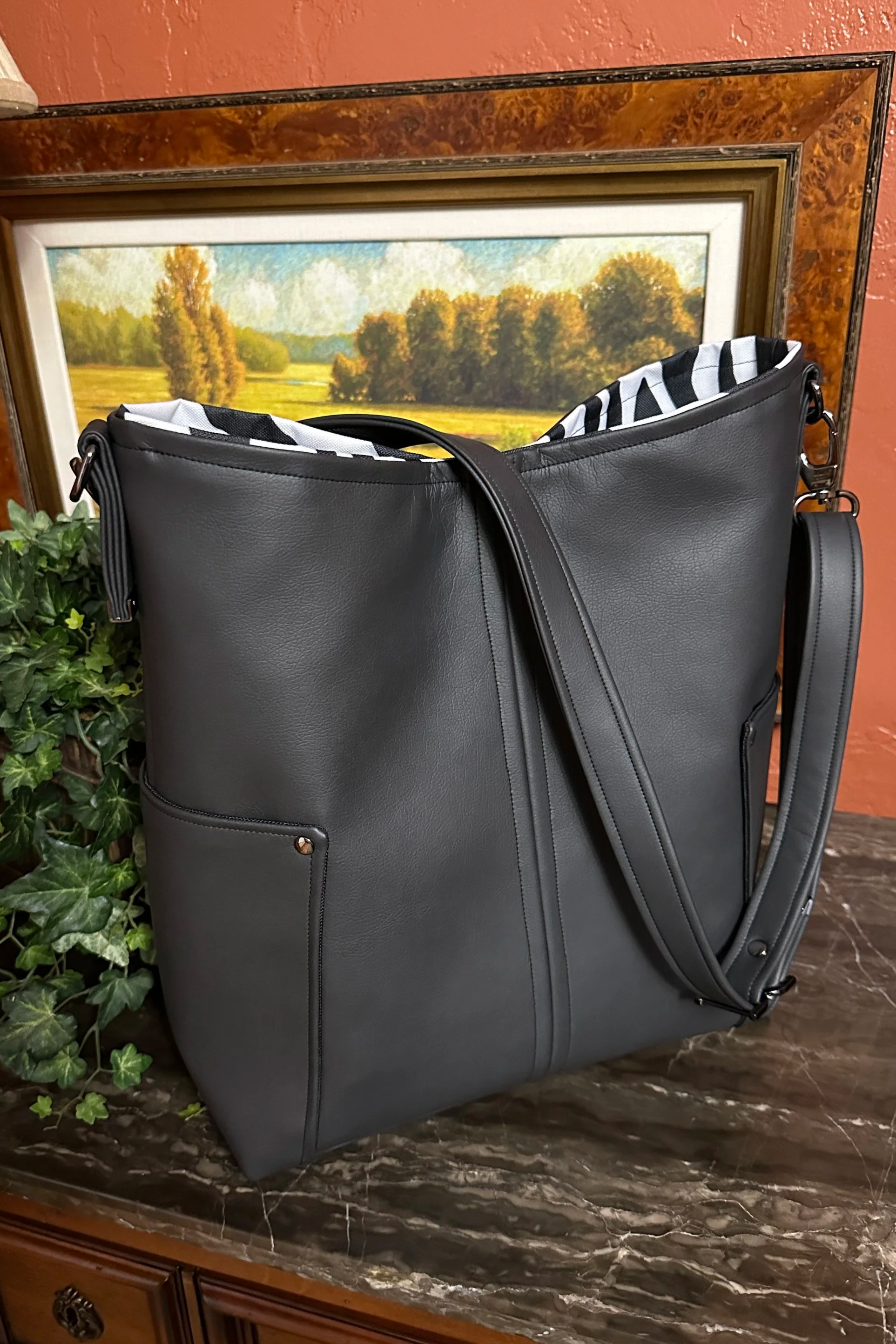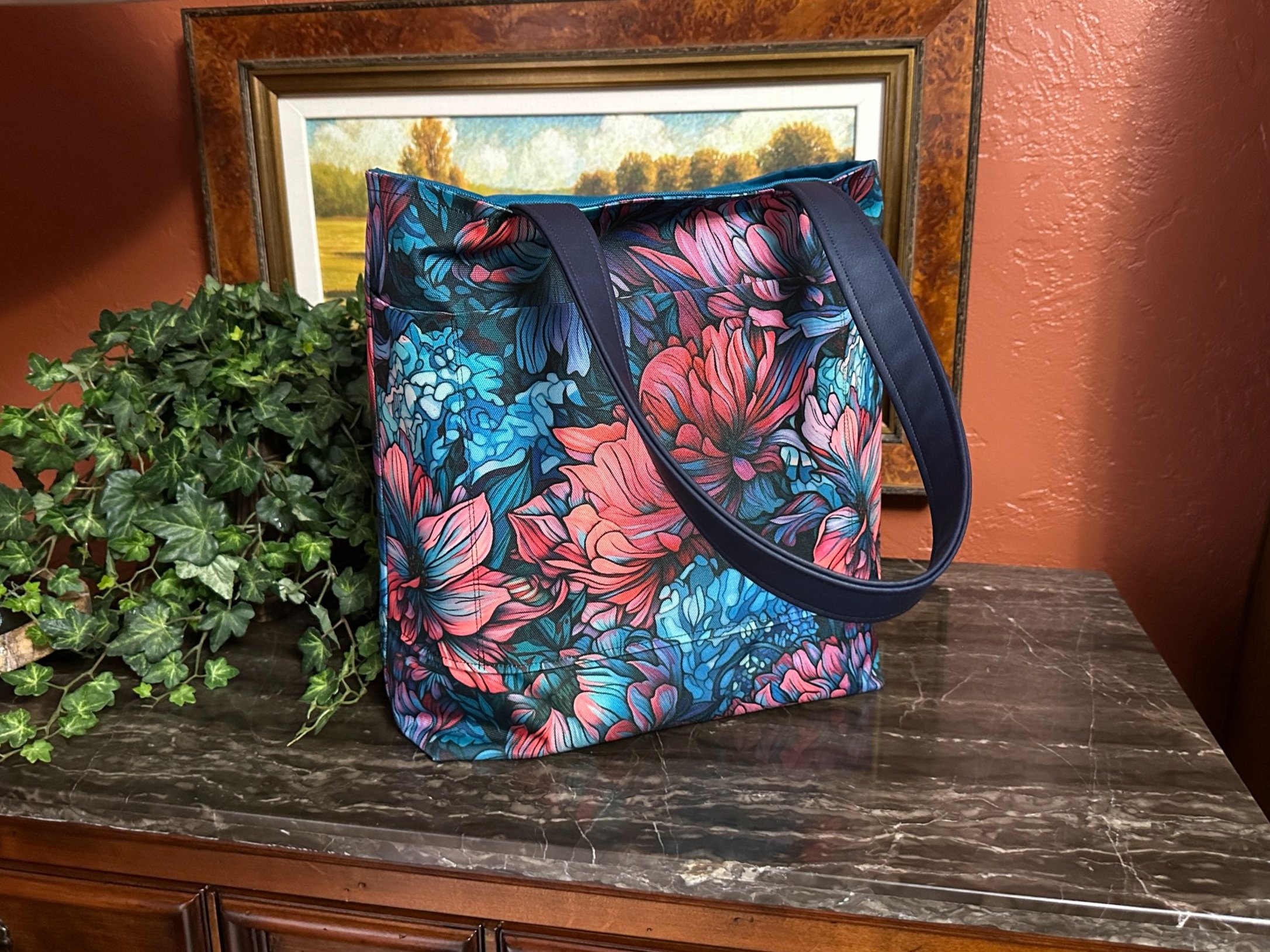 All of my totes are handmade by me. I start with a pattern that has potential and then I re-engineer its design. I change their look by using fabrics with textures; changing the fabric configuration; adding exterior pockets; and changing closures, handle types and adding quality hardware.